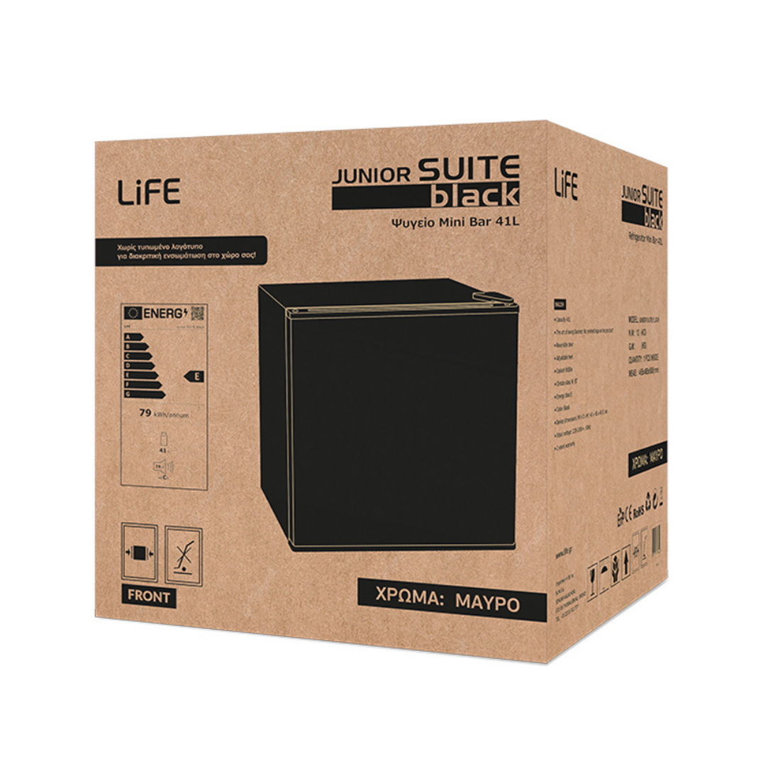 The Mini Bar LIFE Junior Suite Black fridge, with spacious interior, compact exterior dimensions, in black colour, is the ideal choice for small households, rooms to let, hotel rooms and studios.