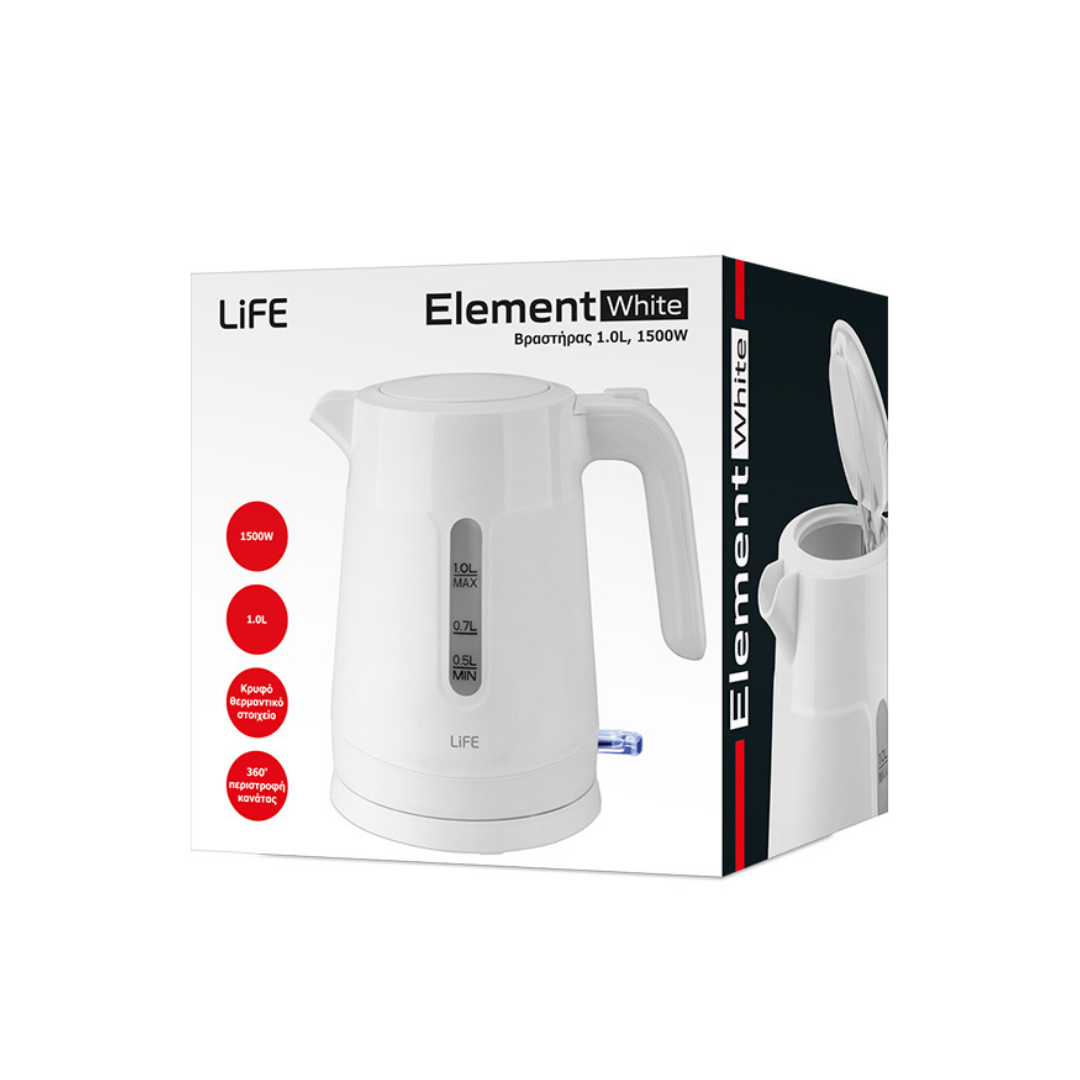 Ο νέος κομψός βραστήρας 1.0 λίτρου LIFE ELEMENT συνδυάζει μοντέρνο σχεδιασμό και υψηλή λειτουργικότητα.