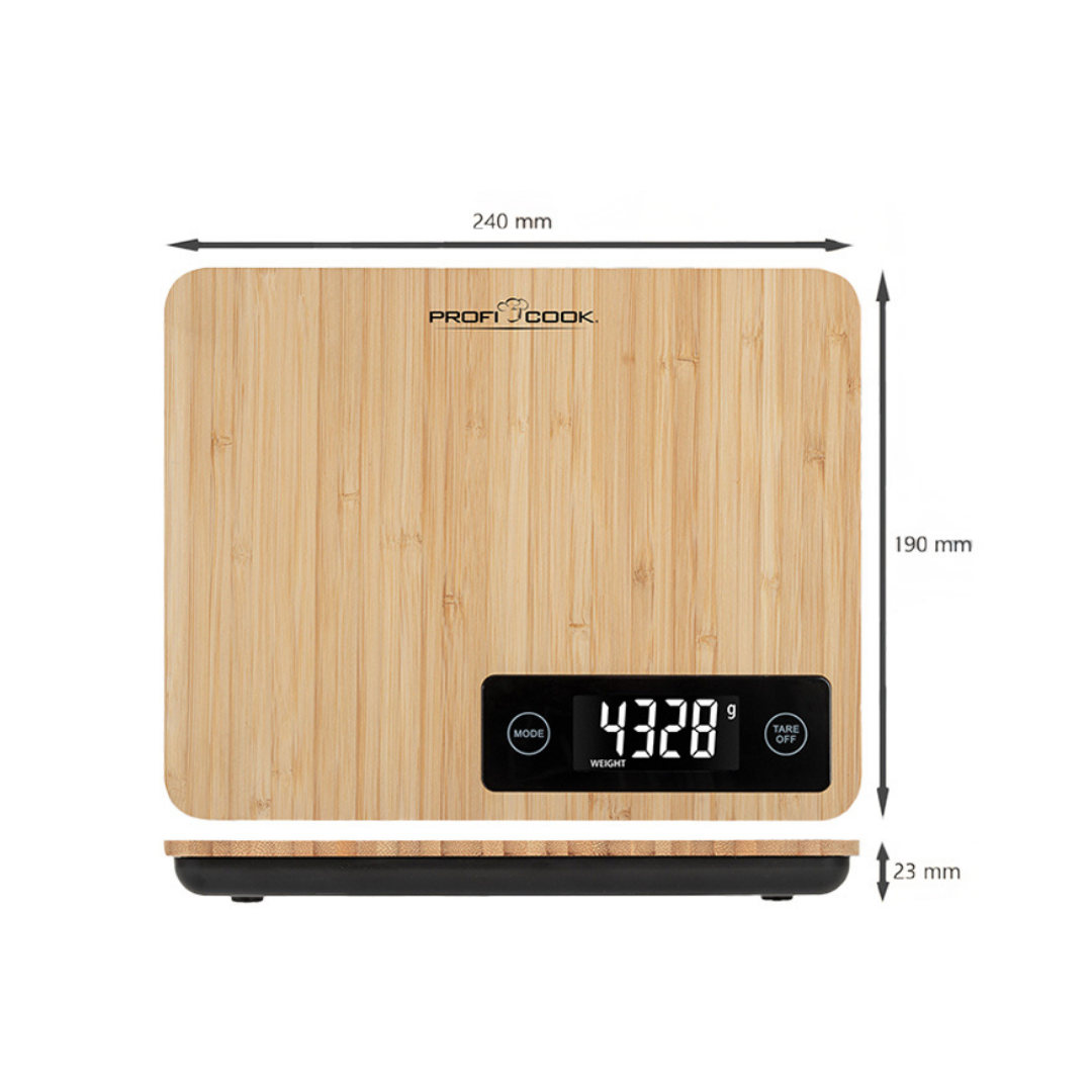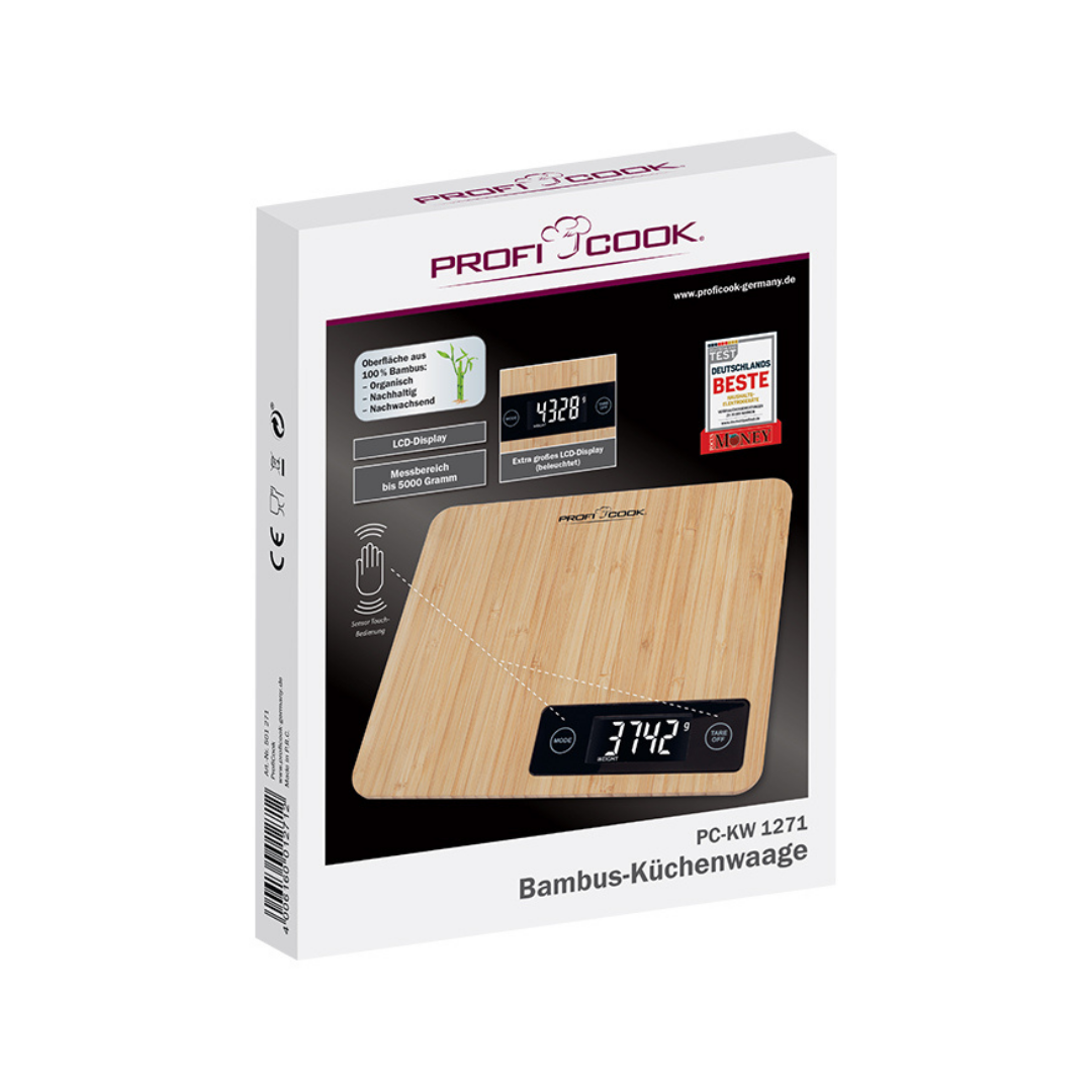 Η νέα bamboo ζυγαριά κουζίνας Profi-Cook αποτελεί τον τέλειο συνδυασμό αισθητικής και ακρίβειας. Με μεγάλη επιφάνεια ζυγίσματος από 100% μπαμπού, η ζυγαριά προσθέτει μια φυσική πινελιά στην κουζίνα σας.