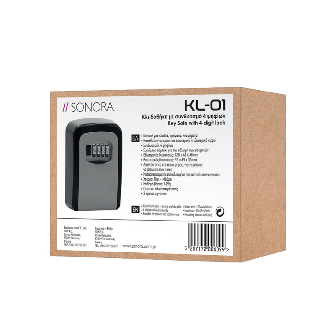 Μοιραστείτε τα κλειδιά σας με εύκολο και ασφαλή τρόπο, χάρη στην πρακτική κλειδοθήκη με συνδυασμό 4 ψηφίων SONORA KL-01. Μία ανθεκτική, οικονομική και ιδανική λύση για Airbnb, ενοικιαζόμενα δωμάτια αλλά και ως μία έξυπνη λύση ασφαλούς αποθήκευσης για κάθε κατοικία. Είναι κατασκευασμένη από ανθεκτικό κράμα αλουμινίου, και μπορείτε να αποθηκεύσετε με ασφάλεια κλειδιά, αλλά και μετρητά ή μικρού μεγέθους τιμαλφή.